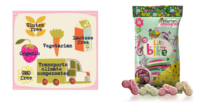 加文卡洛琳設計的包裝袋上的符號,告訴消費者,糖果是有機的,素食主義者,無蛋白,無乳糖,無轉基因和氣候補償。