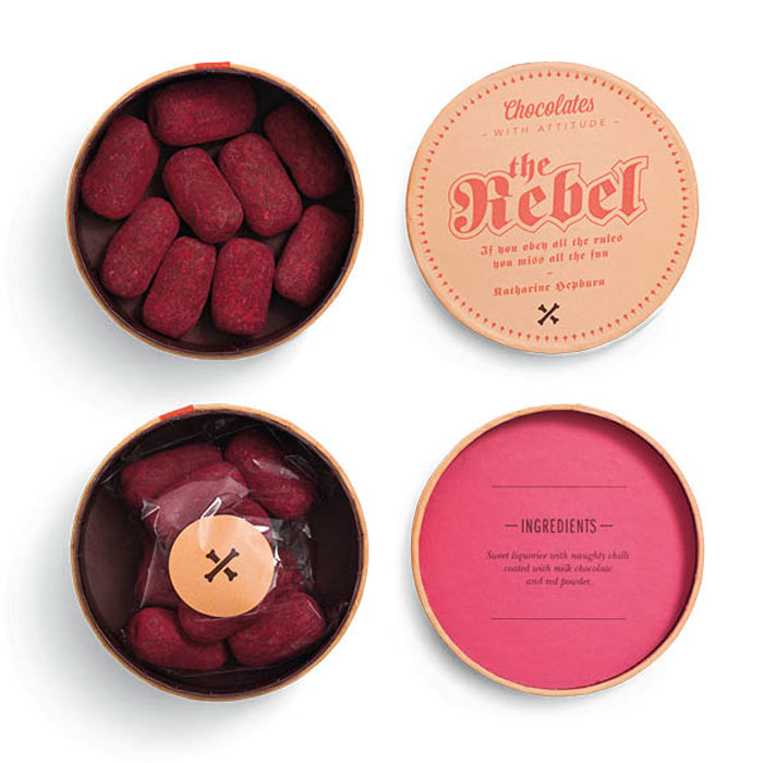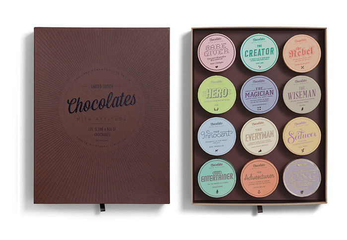 “個性是通過一個獨特的報價,一個獨特的設計和獨特的類型的巧克力表達。設計區分了12種不同的字體,字體的使用,這些小字體是圓形的,像是小帽子。巧克力是可口精品巧克力獨特的配方了。一切都是從地上發展的。”